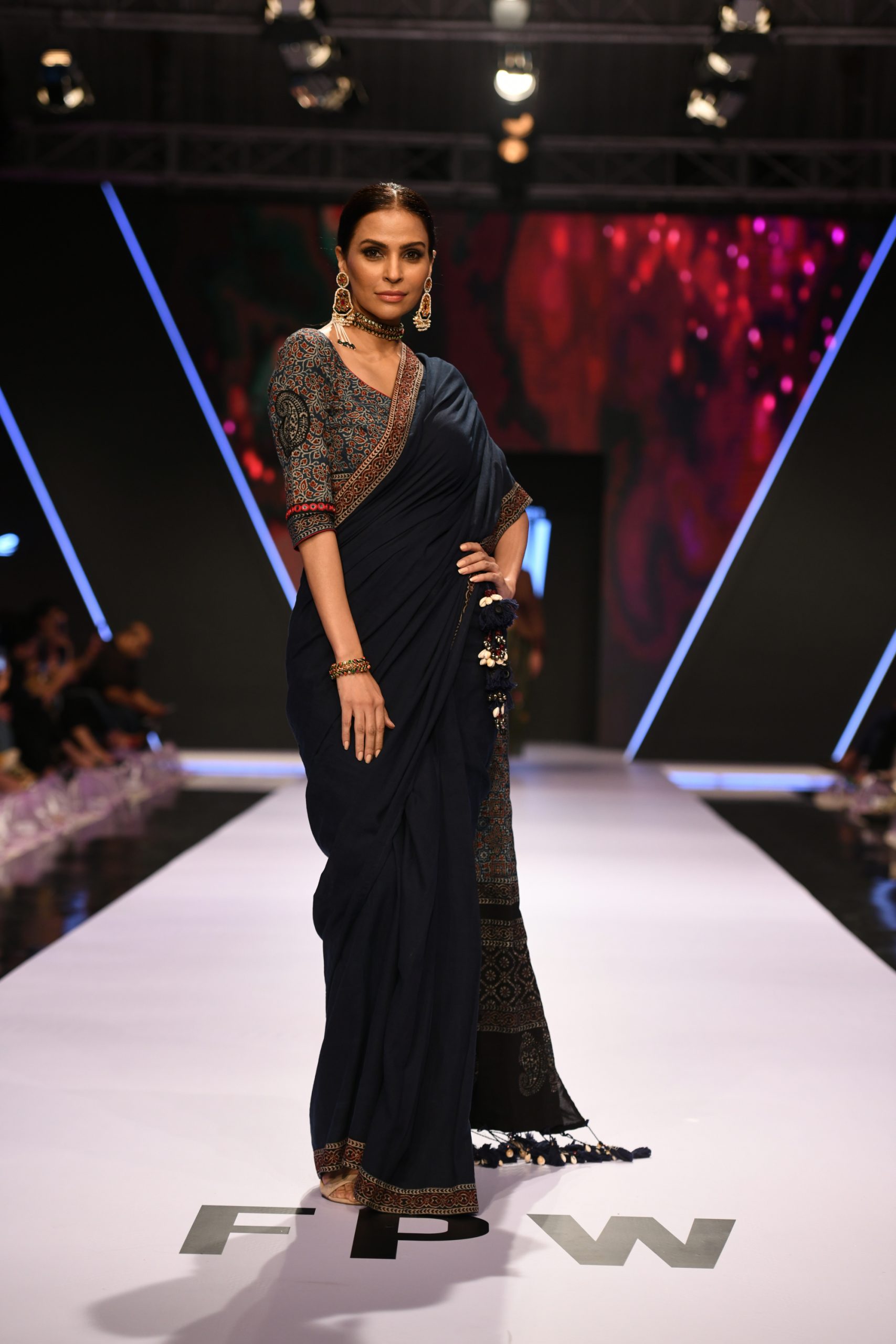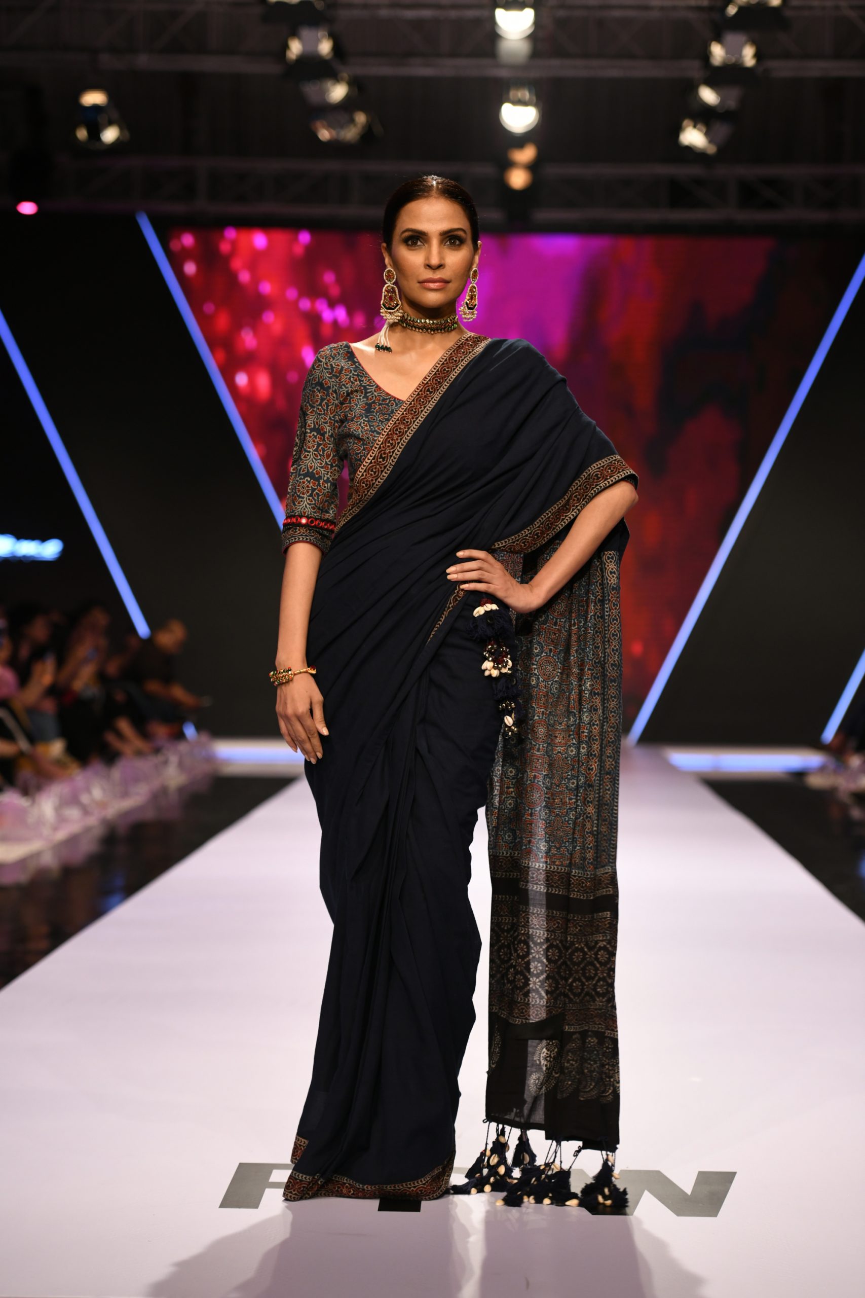 Pure cotton lawn, natural dyed and hand-block printed sari. Tassels on aanchal. Comes with an indigo petticoat and a choice of an Ajrak blouse or a plain indigo/black blouse.
